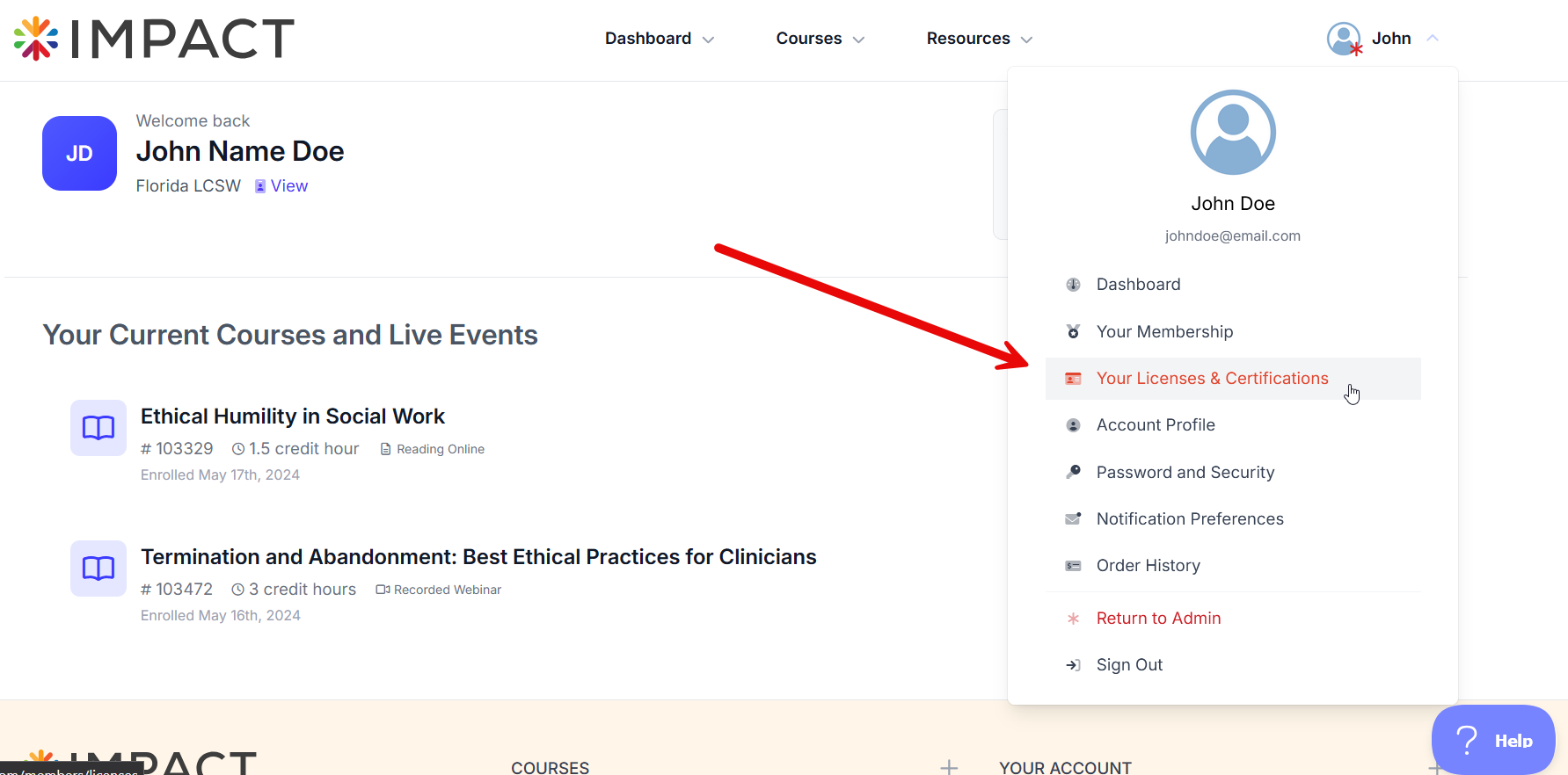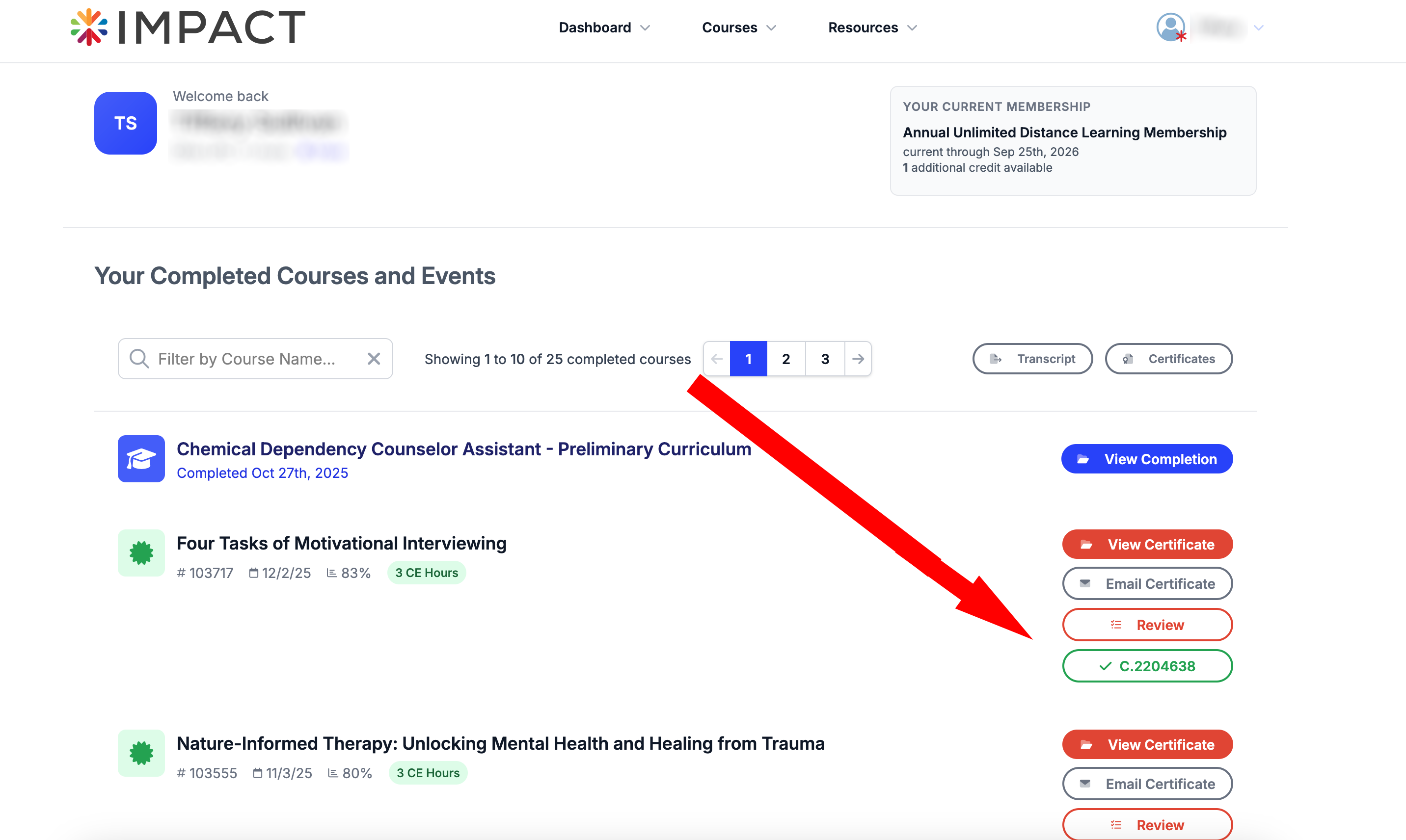 From your Dashboard, go to the Completed Courses page to see if your courses are listed as having been reported to CE Broker, indicated by a green button with a check mark. Clicking the button will show you when you completed the course and when it was reported to CE Broker.