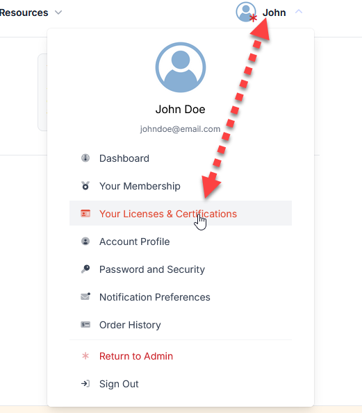 If you are already signed in, you can also reach a list of courses for your special requirements. Click your name in the top right, then select "Licenses & Certifications"
