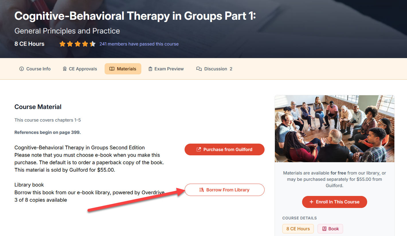 Annual Members of ImpactCE have access to our library of E-books powered by Overdrive! If a course has copies of the book available on Overdrive, you will see a listing in the "Materials" section of the course page with a button that says "Borrow From Library":