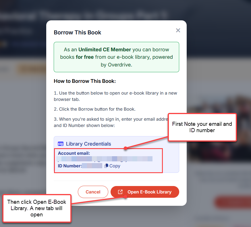 Clicking on the " Borrow From Library" button will show a popup page with an email and ID number to borrow the book via our library. Take note of this email and ID number and click "Open E-book library":