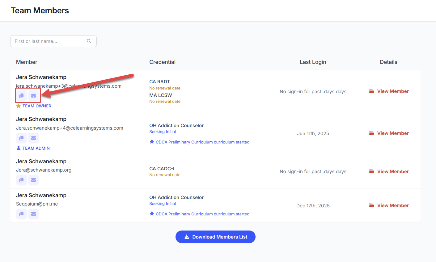 To email a team member, click the purple mail button or blue copy button next to their name and email: