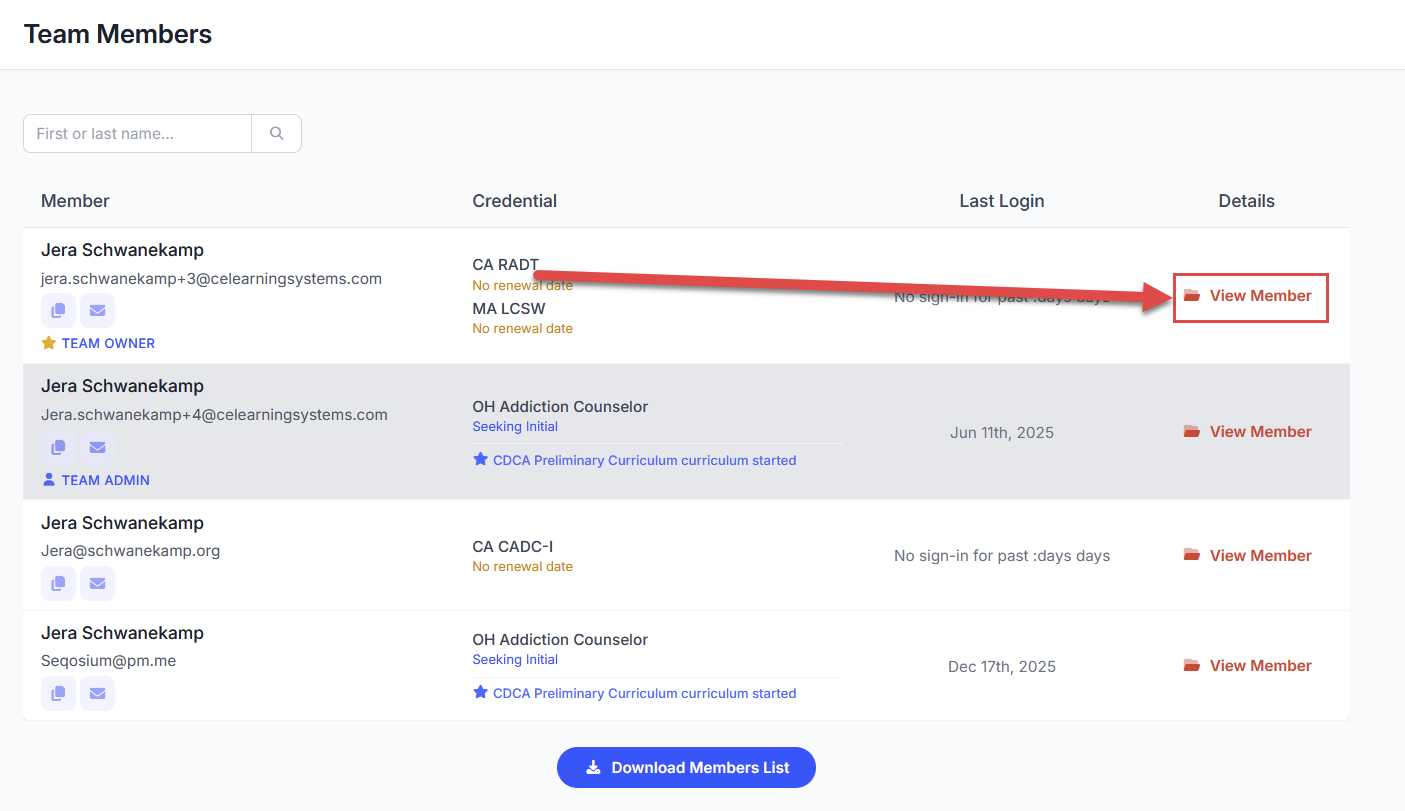 To modify a member's details, including role and seat assignment, click the blue View Member button on the right side of the members list: