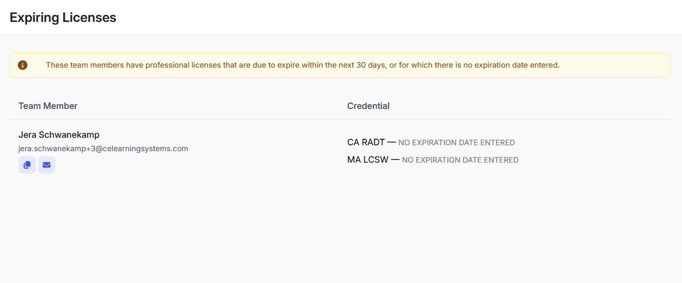 A list of all team members whose entered license is has expired, will expire soon, or has no expiration date entered. To email a member, click Copy Email or Email [Member Name] next to the member's name on the left.