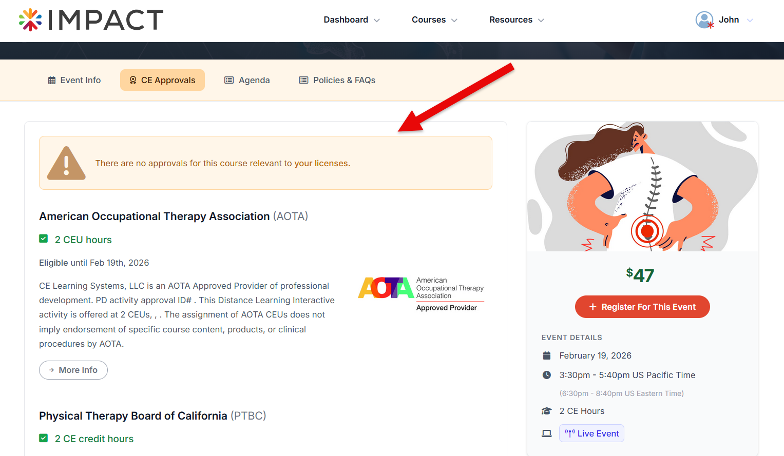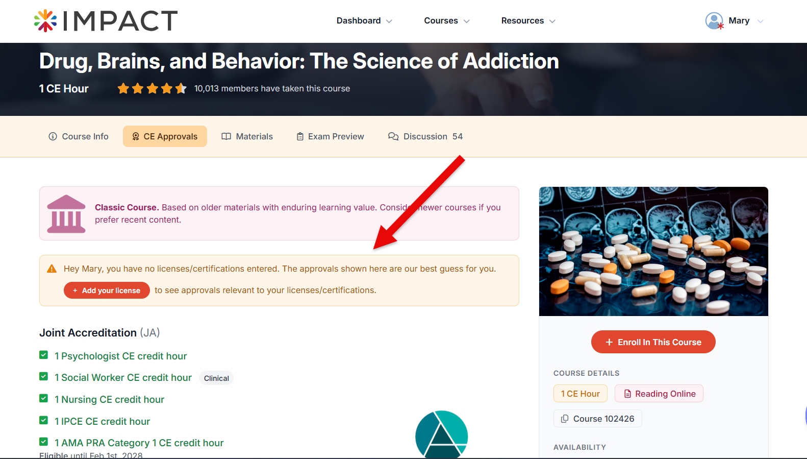 The CE Approvals tab will automatically check the course's CE approval information and your entered license information.