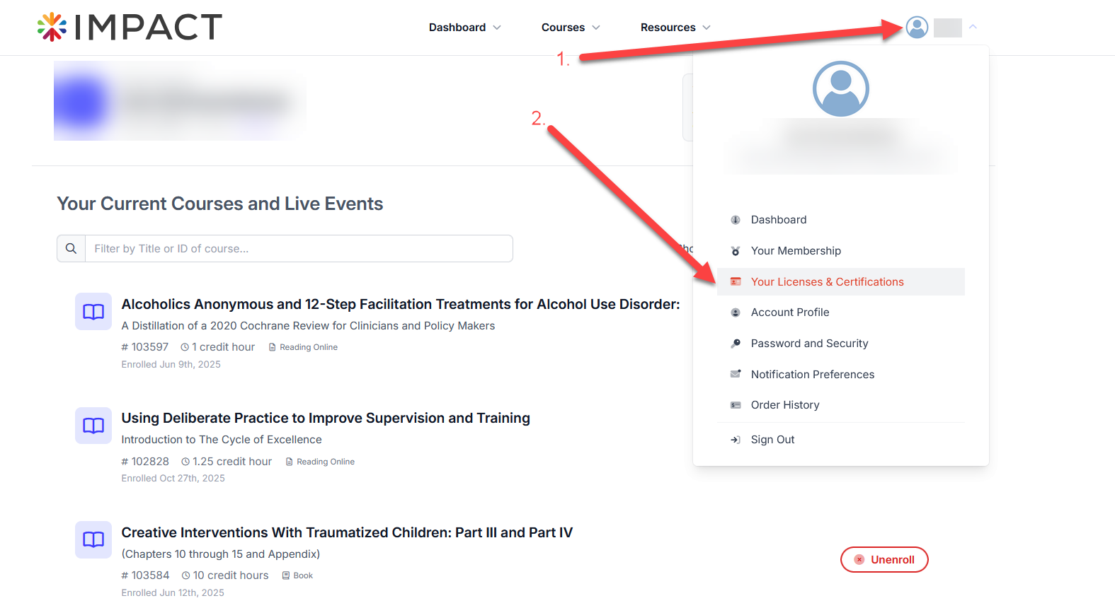 It's important to have your license number(s) on your account so your coursework can be credited properly.  To add a license to your account, first click on your name at the top right of your window, then click Your Licenses and Certifications