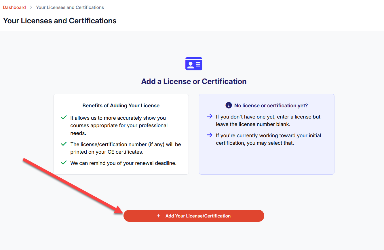 If you have multiple licenses to add, repeat this process by clicking the blue Add Another License/Certification button on your licenses page.