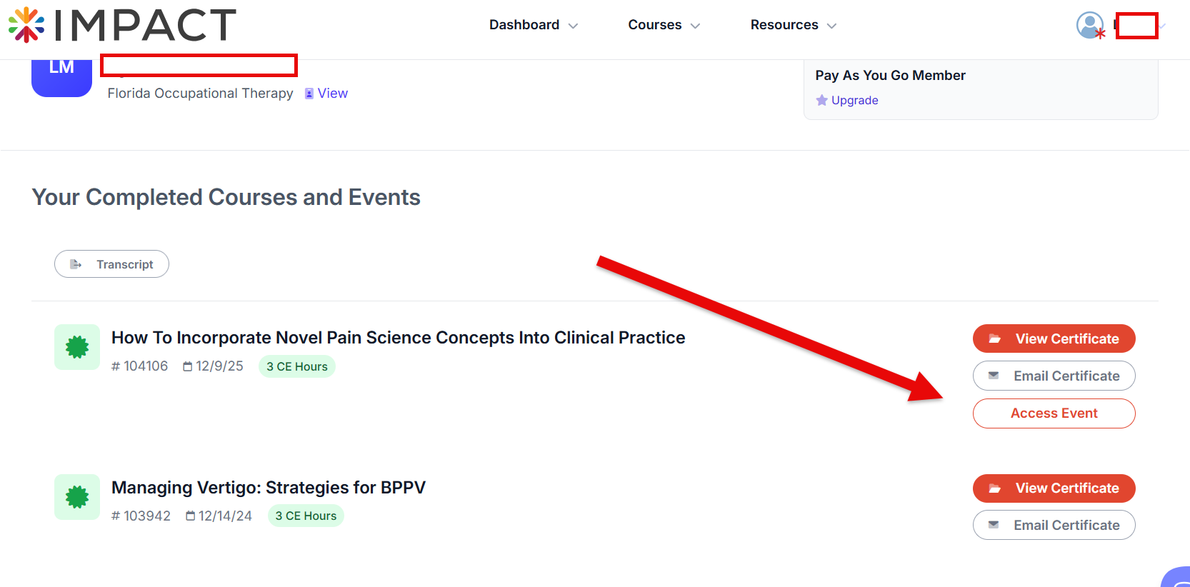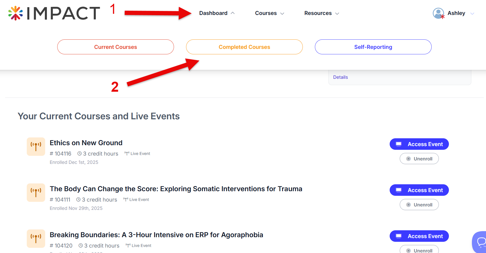 To access the evaluation for any course you've taken, start by going to your Dashboard and selecting Completed Courses in yellow: